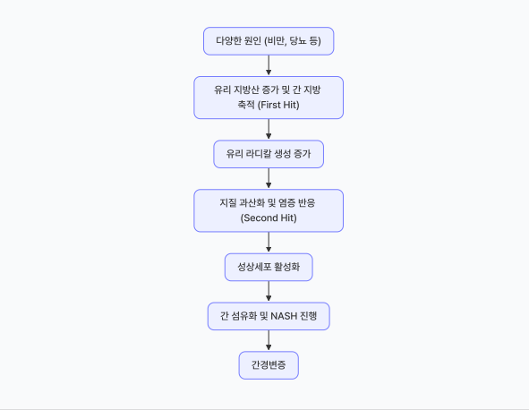 NASH가 발생하는 과정은 매우 복잡해서 하나의 원인으로 설명하기 어려워요. 현재는 '투-히트 가설(Two- Hit Hypothesis)'로 설명하는 경우가 많답니다. 이 가설은 간이 두 번의 공격을 받아 손상된다는 내용이에요.