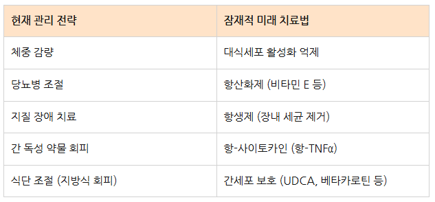 아직 NASH를 치료하는 특별한 약물은 없어요. 그래서 가장 중요한 치료 전략은 관련 원인을 찾아서 제거하는 것이랍니다. 체중 감량, 고지혈증 치료, 과혈당증 치료가 핵심이에요. 간에 해로운 약물은 당연히 피해야 하죠.