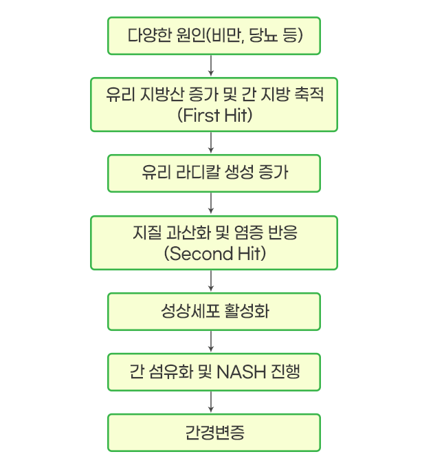 NASH가 발생하는 과정은 매우 복잡해서 하나의 원인으로 설명하기 어려워요. 현재는 '투-히트 가설(Two- Hit Hypothesis)'로 설명하는 경우가 많답니다. 이 가설은 간이 두 번의 공격을 받아 손상된다는 내용이에요.