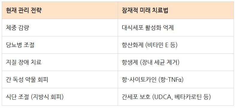 아직 NASH를 치료하는 특별한 약물은 없어요. 그래서 가장 중요한 치료 전략은 관련 원인을 찾아서 제거하는 것이랍니다. 체중 감량, 고지혈증 치료, 과혈당증 치료가 핵심이에요. 간에 해로운 약물은 당연히 피해야 하죠.