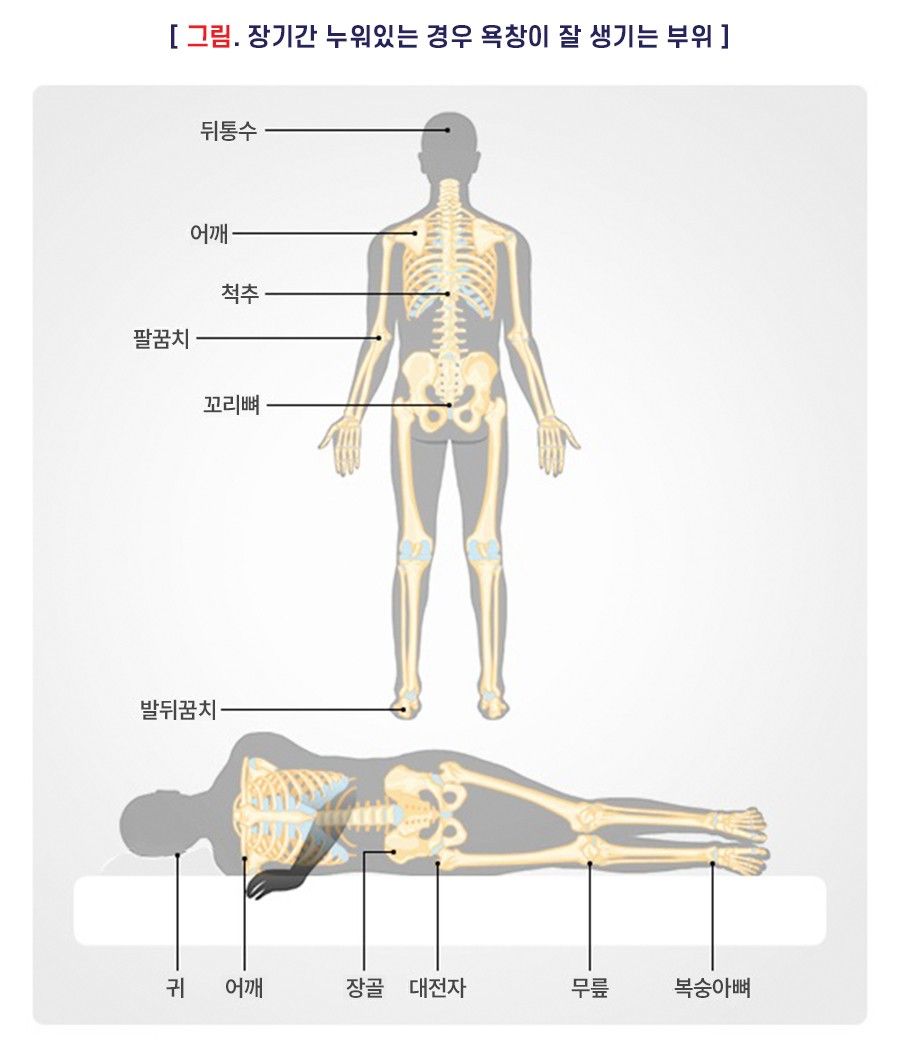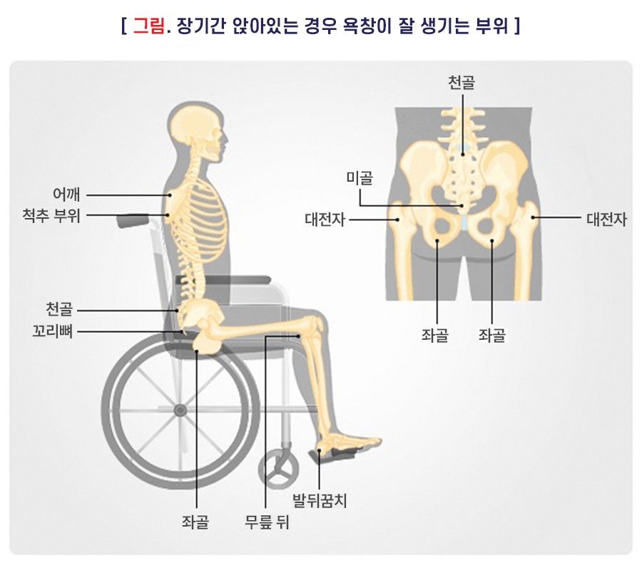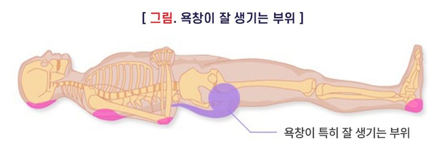 • 욕창은 뒤통수, 꼬리뼈, 무릎, 발뒤꿈치와 같이 뼈가 돌출된 부위가 오랫동안 압박되거나 반복적으로 마찰을 받아 피부와 그 아래 조직이 손상된 상태를 말합니다.