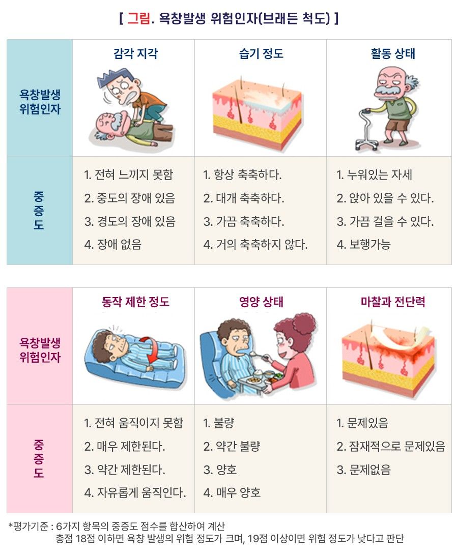 - 대표적인 욕창 발생 위험 평가 도구인 브래든 척도(Braden scale)는 감각 지각(Sensory Perception), 습기 정도(Moisture), 활동 상태(Activity), 동작 제한 정도(Mobility), 영양 상태(Nutrition), 마찰과 전단력(Friction/Shear) 등 6개 항목으로 이루어집니다. 각 항목은 4점 척도(마찰과 전단력 영역은 3점 척도)이고, 점수가 낮을수록 위험이 큰 것입니다. 18점 이하면 욕창 발생의 위험이 높으며, 19점 이상이면 위험이 낮다고 판정합니다.