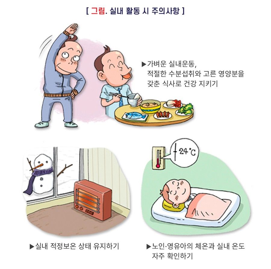 갑작스러운 추운 날씨에는 안전한 실내 난방으로 적정 실내온도(18-20℃)를 유지하고, 하루에 2~3시간 간격으로 3번, 최소한 10분에서 30분정도 창문을 열어 적절히 환기를 시켜줍니다.