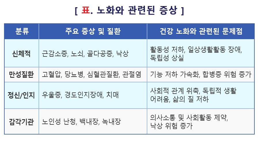 • 우리나라는 65세 이상 노인 인구 비율이 20%를 넘겨 초고령사회에 들어섰습니다. 우리가 원하는 삶은 단순히 오래 사는 것(장수)을 넘어 ‘건강하게 나이 드는 것', 즉 건강 노화(Healthy Aging)입니다. 건강 노화는 나이가 들어도 신체적, 정신적, 사회적 기능을 최대한 유지하면서 삶의 질을 높이는 것을 의미합니다. 이는 질병 유무와 상관없이 스스로 일상생활을 영위하고 사회에 적극적으로 참여할 수 있는 능력을 강조합니다.