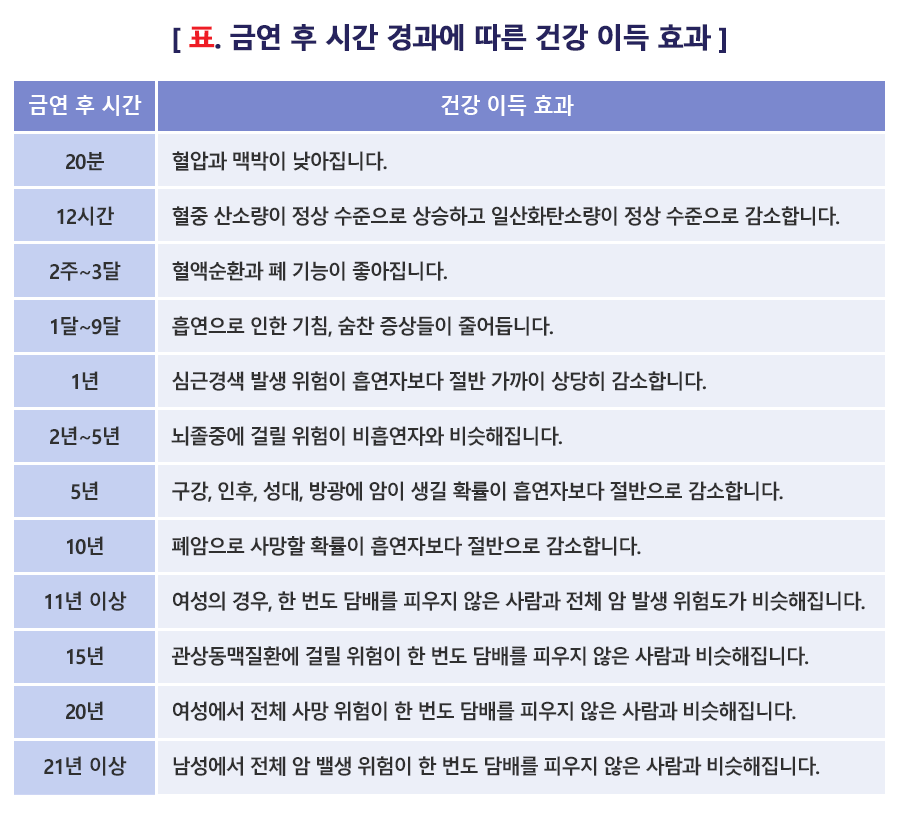 • 담배를 끊으면 즉시 건강이 좋아지기 시작하며, 약물치료와 상담을 병행하면 금연 성공 가능성이 크게 높아집니다.