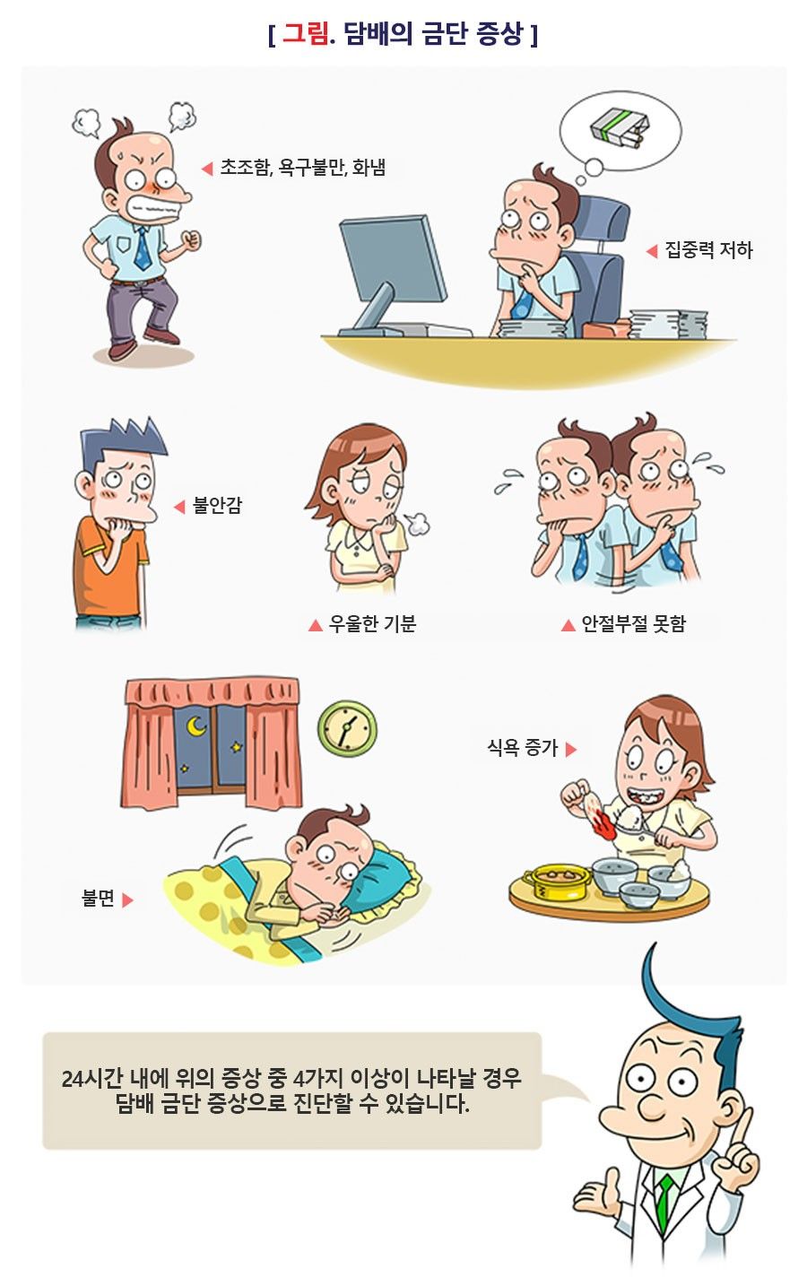 담배에 함유된 니코틴은 뇌의 보상회로를 자극해 쾌감을 유발합니다. 흡연으로 보상회로가 자극되면 뇌는 같은 행동을 반복해 지속적인 쾌감을 느끼려고 하며, 이런 반복이 '니코틴 중독'을 형성합니다. 니코틴 중독은 금연 후 금단 증상과 다양한 신체적, 정신적 증상을 일으킵니다. 미국정신의학회에서 발간한 정신장애의 진단 및 통계 편람(The Diagnostic and Statistical Manual of Mental Disorders, Fifth Edition, DSM-5)의 금단 증상 진단기준에 따르면, 아래 증상 중 4가지 이상이 나타날 때 담배 금단 증상으로 진단할 수 있습니다.