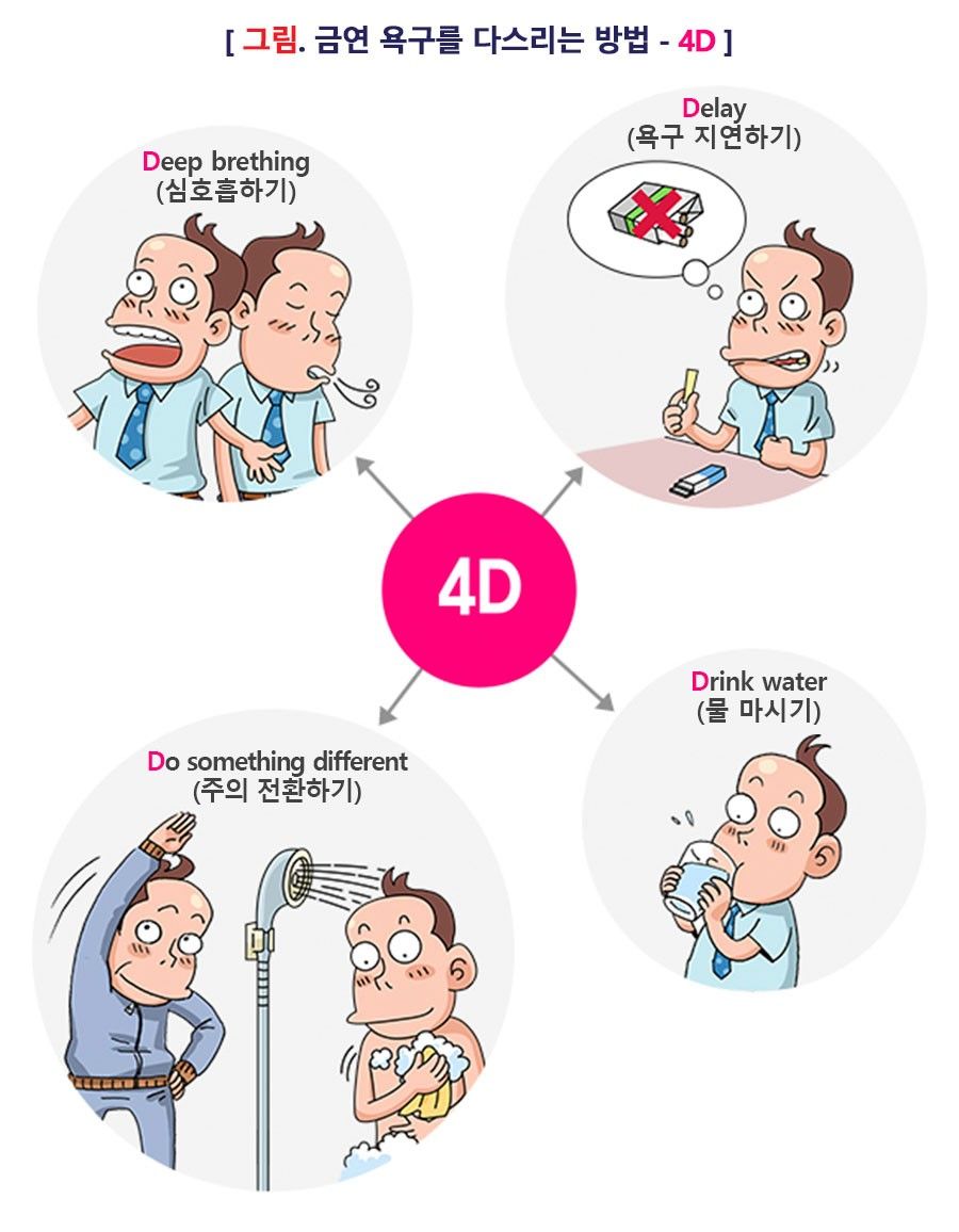 금연을 위한 행동 요법 중 흡연 욕구를 다스리는 방법은 2020년 미국질병통제예방센터 자료, 2022년 연구 등 여러 가이드라인에서 제안한 바 있습니다. 그중 4D는 많은 흡연자가 금연을 시도할 때 선택하는 방법입니다.
