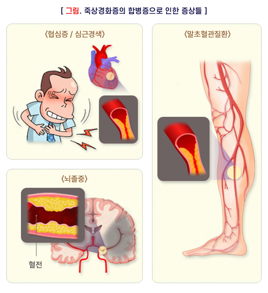 • 죽상(동맥)경화증은 증상 없이 조용히 진행되는 만성 질환으로, 심근경색, 뇌졸중 등 생명을 위협하는 합병증을 일으킬 수 있습니다.