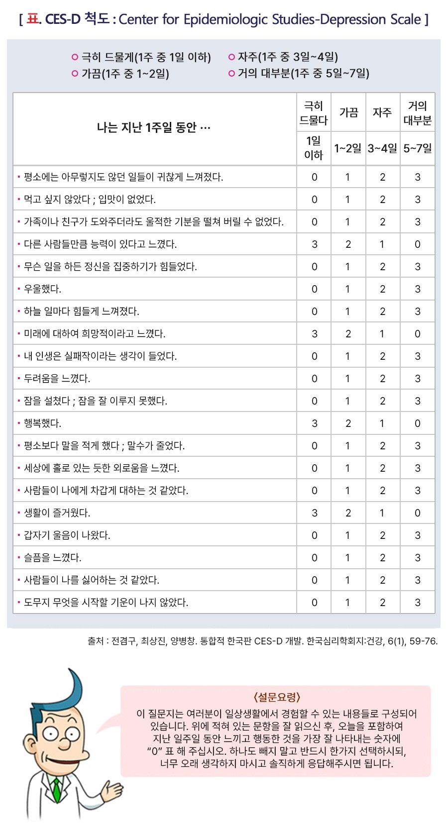 (1) CES-D 척도(Center for Epidemiologic Studies-Depression Scale, CES-D Scale)는 우울증의 선별검사 및 자가진단에 가장 많이 사용되는 척도로 총 20개 문항으로 구성됩니다. 총점 16점 이상이면 경도, 21점 이상이면 중등도, 25점 이상이면 중증 우울 증상을 의심하여 전문가와의 상담이 필요합니다.