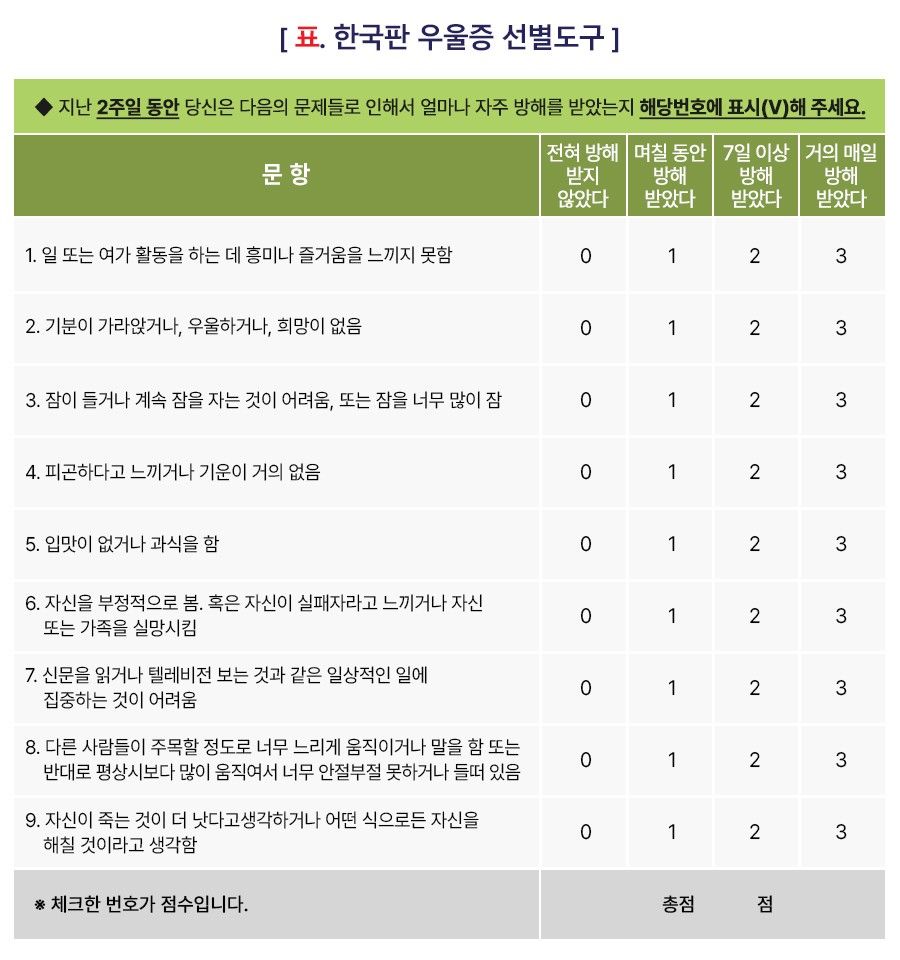 (2) PHQ-9(Patient Health Questionnaire-9)는 DSM-5의 주요 우울증 진단 기준에 해당하는 9항목 자가 보고식 설문지입니다. 총점 9점 이상이면 우울증을 의심해 전문가와의 상담이 필요합니다.
