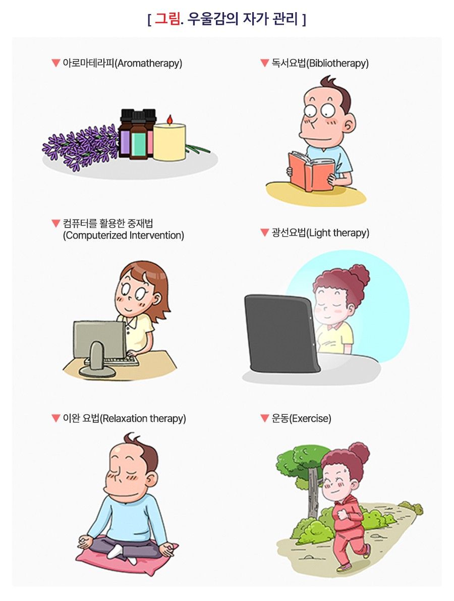 • 근거가 있는 우울감의 자가 관리법에는 아로마테라피, 독서요법, 컴퓨터 기반 자가 관리법, 광선요법, 이완 요법, 운동 등이 있습니다.