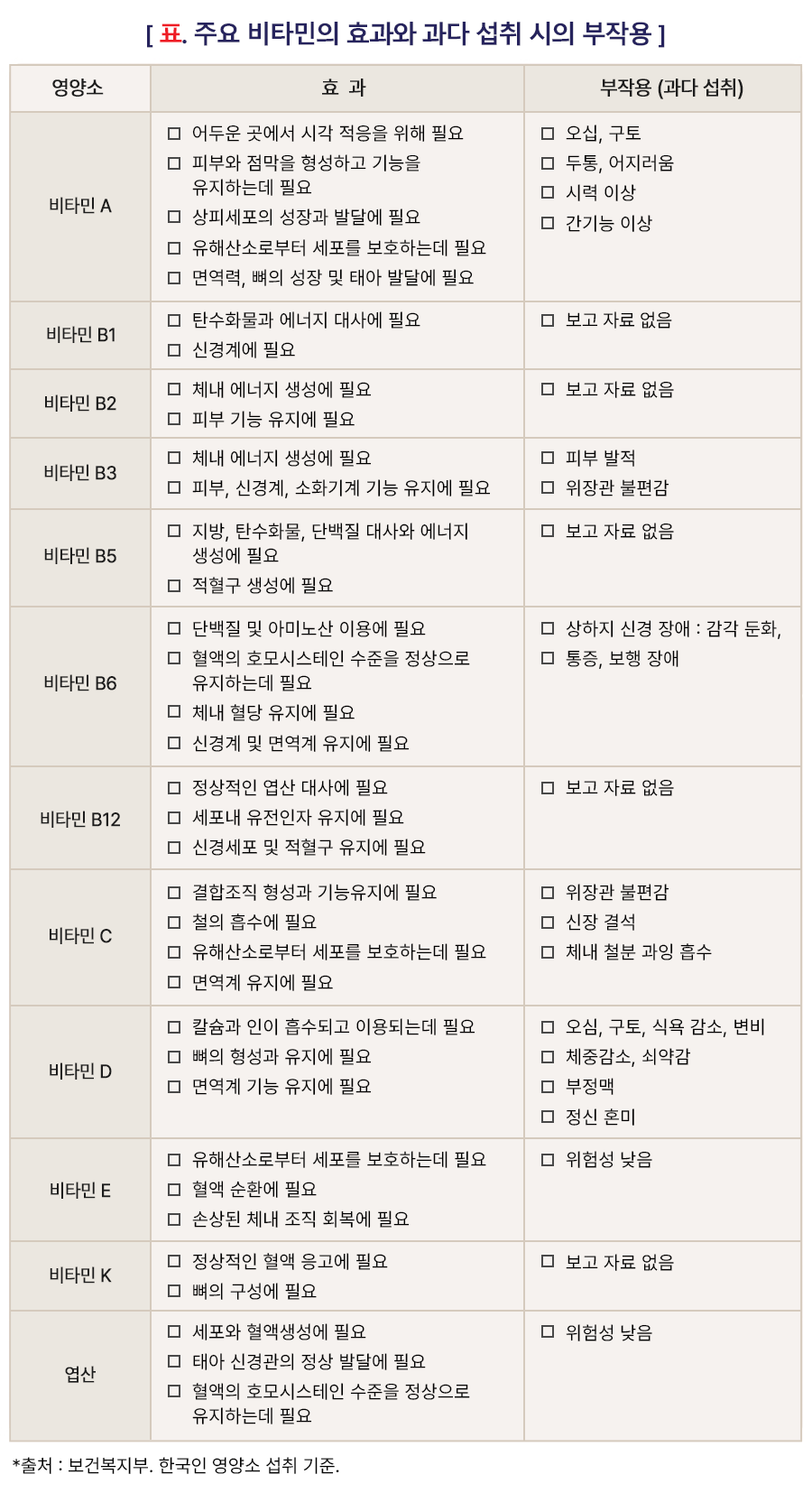 • 수용성 비타민보다는 지용성 비타민을 과하게 섭취할 경우 체내에 축적되어 여러 부작용이 나타날 수 있습니다.