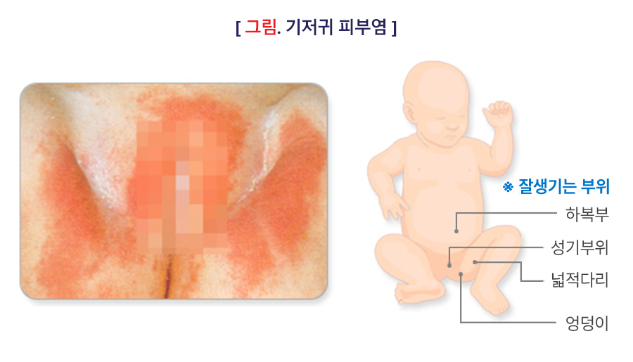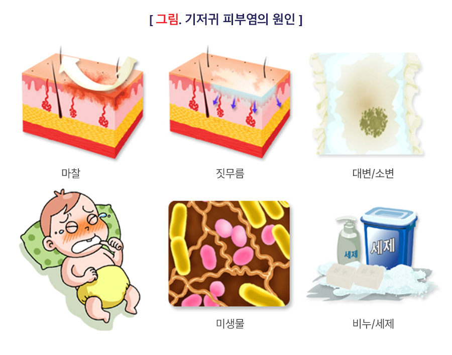 • 기저귀와의 마찰, 습기, 소변과 대변의 자극이 주요 원인입니다.