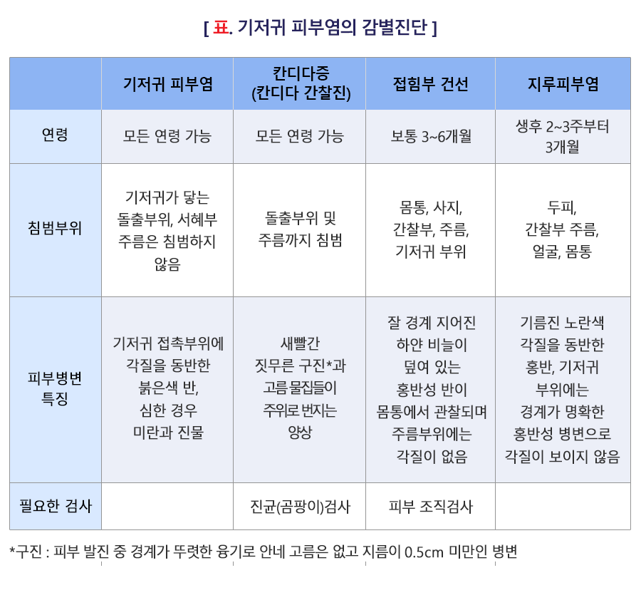 가장 큰 감별점은 샅고랑 부위(사타구니), 즉 살이 접히는 안쪽의 피부염 발생 여부입니다. 샅고랑 부위에는 기저귀가 직접 닿지 않기 때문에 기저귀피부염의 초기에는 병변이 생기지 않습니다. 다음 표에 기저귀 피부염과 비슷한 부위에 발생해 감별이 필요한 질환들을 정리했습니다.