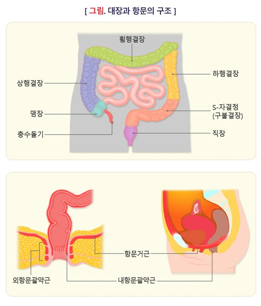 대장은 기다란 관 모양으로 위치에 따라 맹장, 상행결장, 횡행결장, 하행결장, S-자결장(구불 결장), 직장으로 나눌 수 있으며 총 길이는 1.5 m 입니다. 대장의 내용물은 대부분 음식물 찌꺼기와 수분, 전해질, 세균 그리고 가스로 이루어져 있습니다. 대장은 이 중 수분과 전해질을 흡수하고, 배변과 배변 사이에 장 내용물을 저장하였다가 항문 밖으로 배출시키는 역할을 합니다. 직장과 연결된 항문 역시 배변에 아주 중요한 역할을 합니다. 항문관의 길이는 약 3~4 cm이며, 주변에 내항문괄약근, 외항문괄약근, 항문거근 등 배변과 관련한 근육이 많이 분포해 있습니다.