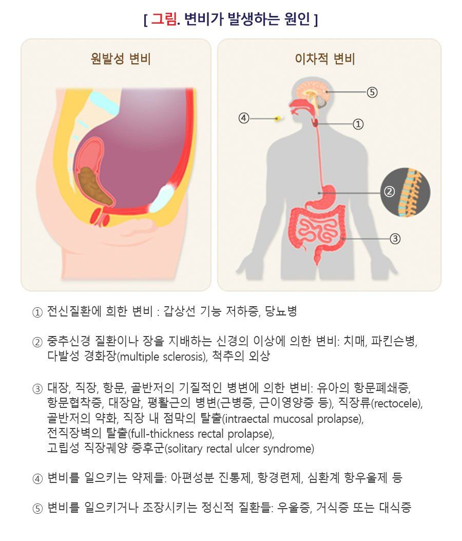 변비의 원인은 크게 다른 질환에 의해 이차적으로 증상이 발생한 경우와 명확한 원인 없이 대장, 직장의 운동기능장애로 인해 발생하는 원발성 또는 기능성 변비로 나눌 수 있습니다.