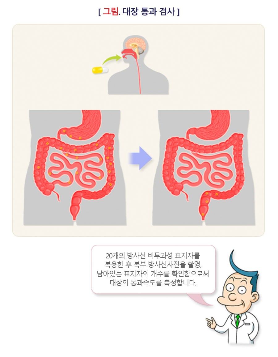 통과 속도가 느린 것에 대한 객관적인 증거가 필요할 때 시행하는 검사입니다. 방사선 비투과성 표지자 검사(Radiopaque marker study)는 20개의 방사선 비투과성 표지자를 한번 복용한 후 5일째 복부 X선 검사를 시행하는 방법이며, 표지자가 복용 후 5일 동안 80% 이상 대장을 통과하는 것이 정상인데 대장에 남아있는 경우를 장무력증(Colonic inertia) 또는 지연통과(Delayed transit)라고 합니다. 검사의 민감도를 올리기 위해 연속 3일간 24시간 간격으로 서로 다른 모양의 표지자를 복용하고 72, 96, 120시간 째에 X선 검사를 시행하는 방법도 있습니다. 이때는 120시간 후에 네 개 이상의 표지자가 계속 남아 있으면 통과 속도가 느리다고 할 수 있습니다.