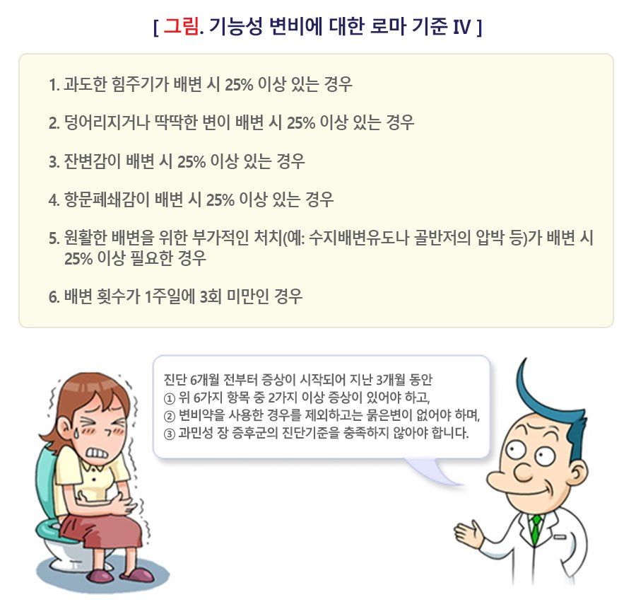 • 변비는 배변 횟수 감소(주 3회 미만), 단단한 변, 불완전한 배변감, 과도한 힘주기, 항문폐쇄감 등이 6개월 전부터 시작되어 지난 3개월 동안 지속되는 상태를 말합니다.