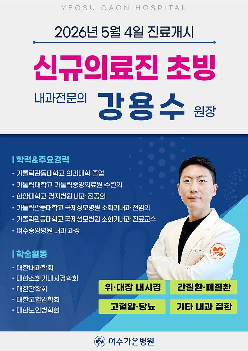 여수가온병원의 신규 의료진 내과전문의 강용수 원장님을 소개합니다!